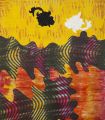 My work is known for its use of varied depictions of natural “scenes”, whether stereotypical landscape views or underwater scenes. The beauty and fragility of life and the tragedy of man’s intervention is my subject. There are few paradises left. As of 2014, I still am using found fabrics from Africa and elsewhere, coupled with mixed paint applications and photo transfers. My use of African prints has added to my vocabulary of forms and patterns. Often their prints use symbolic depictions of natural forms and were recognized by me as similar to my own abstracted natural forms and backgrounds. The manufactured prints add an exotic and surprising aspect to the work. This allows for greater variety and originality in the paintings and an added layer of content that is more specific and somewhat representational. I like the feeling of “craft” that results. The content and meaning of my work has become clearer to the viewer. I am interested in the wildly varied combination of found imagery and depictions of subject that this method has afforded me. From the inspiration of ancient Asian prints, to the contemporary printed motifs inspired by African fabrics, is quite a journey. Ironically, the hand painting has mostly disappeared. Collaged materials and photo imagery has opened a whole new world for me.