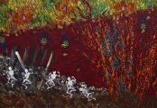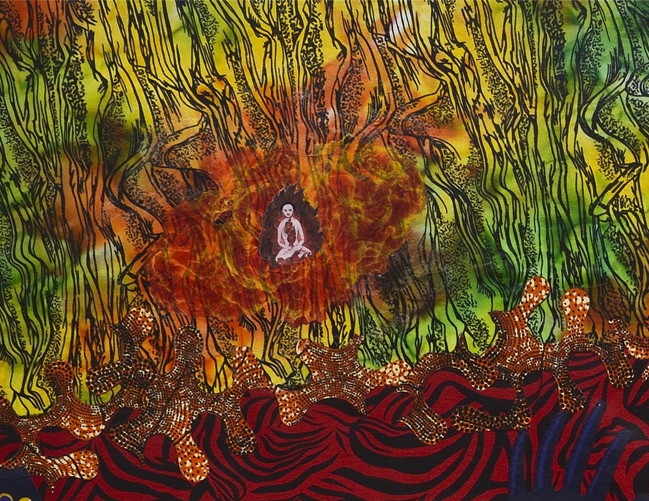 My work is known for its use of varied depictions of natural “scenes”, whether stereotypical landscape views or underwater scenes. The beauty and fragility of life and the tragedy of man’s intervention is my subject. There are few paradises left. As of 2014, I still am using found fabrics from Africa and elsewhere, coupled with mixed paint applications and photo transfers. My use of African prints has added to my vocabulary of forms and patterns. Often their prints use symbolic depictions of natural forms and were recognized by me as similar to my own abstracted natural forms and backgrounds. The manufactured prints add an exotic and surprising aspect to the work. This allows for greater variety and originality in the paintings and an added layer of content that is more specific and somewhat representational. I like the feeling of “craft” that results. The content and meaning of my work has become clearer to the viewer. I am interested in the wildly varied combination of found imagery and depictions of subject that this method has afforded me. From the inspiration of ancient Asian prints, to the contemporary printed motifs inspired by African fabrics, is quite a journey. Ironically, the hand painting has mostly disappeared. Collaged materials and photo imagery has opened a whole new world for me.