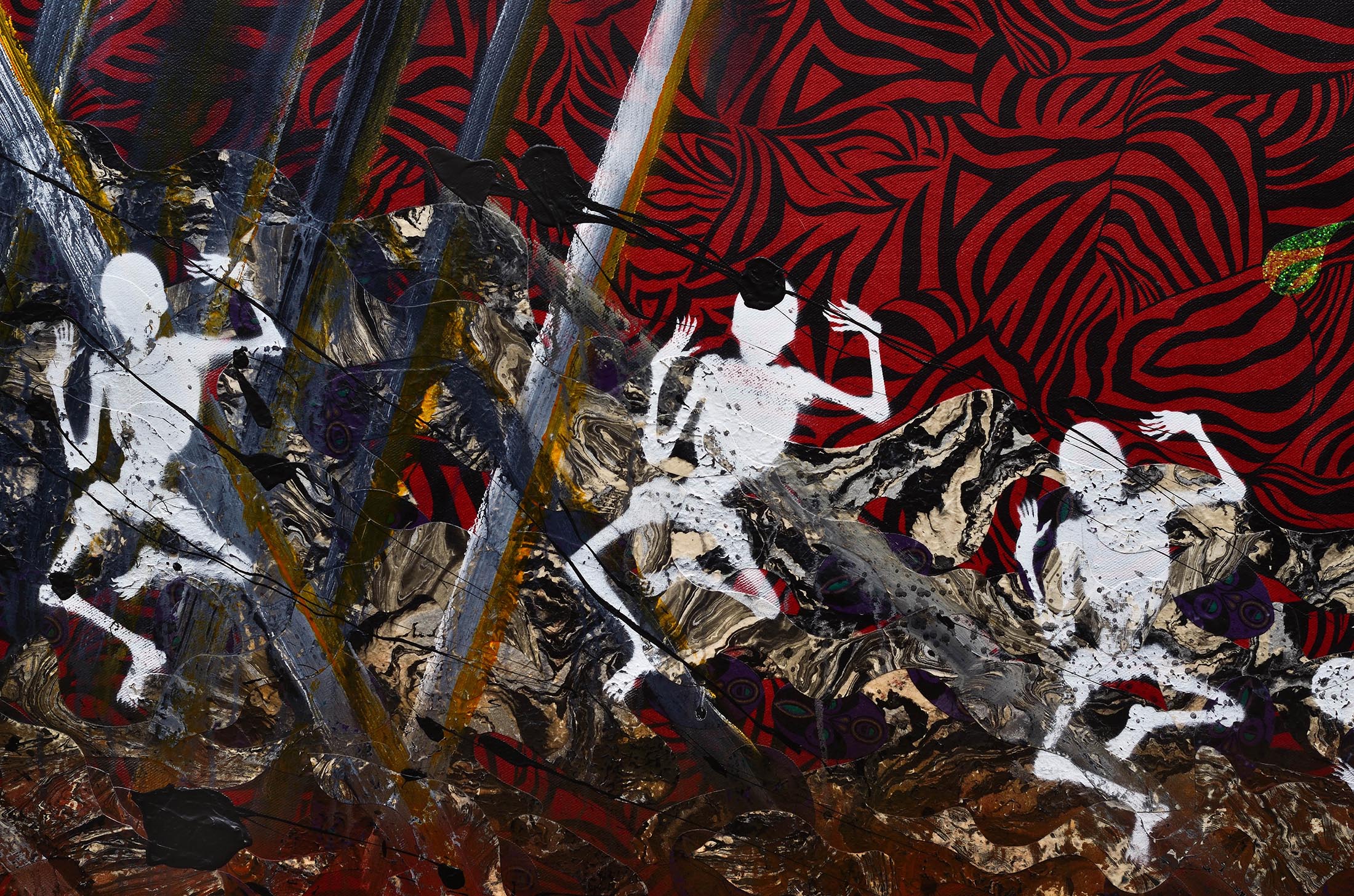 Fabric collage, acrylic paint, paper, photo downloads, spray paint.