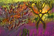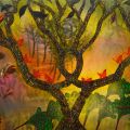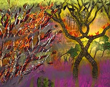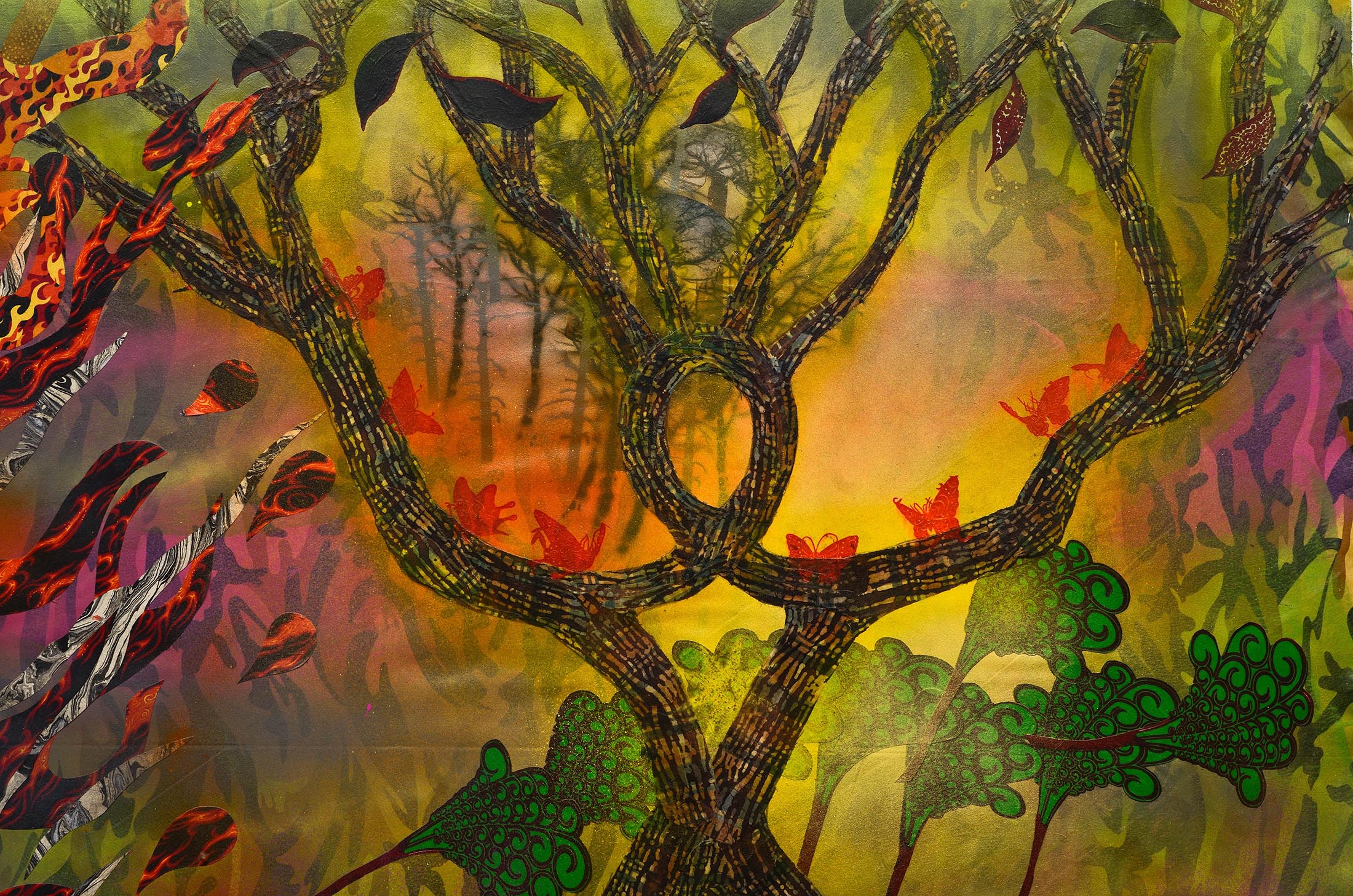 My work is known for its use of varied depictions of natural “scenes”, whether stereotypical landscape views or underwater scenes. The beauty and fragility of life and the tragedy of man’s intervention is my subject. There are few paradises left. As of 2014, I still am using found fabrics from Africa and elsewhere, coupled with mixed paint applications and photo transfers. My use of African prints has added to my vocabulary of forms and patterns. Often their prints use symbolic depictions of natural forms and were recognized by me as similar to my own abstracted natural forms and backgrounds. The manufactured prints add an exotic and surprising aspect to the work. This allows for greater variety and originality in the paintings and an added layer of content that is more specific and somewhat representational. I like the feeling of “craft” that results. The content and meaning of my work has become clearer to the viewer. I am interested in the wildly varied combination of found imagery and depictions of subject that this method has afforded me. From the inspiration of ancient Asian prints, to the contemporary printed motifs inspired by African fabrics, is quite a journey. Ironically, the hand painting has mostly disappeared. Collaged materials and photo imagery has opened a whole new world for me.