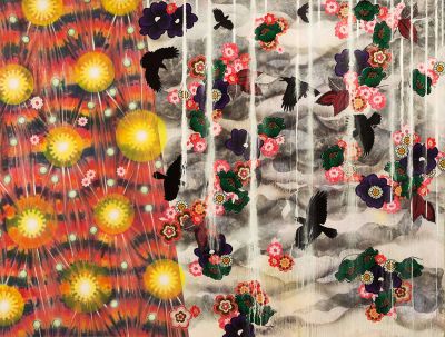 My work is known for its use of varied depictions of natural “scenes”, whether stereotypical landscape views or underwater scenes. The beauty and fragility of life and the tragedy of man’s intervention is my subject. There are few paradises left. As of 2014, I still am using found fabrics from Africa and elsewhere, coupled with mixed paint applications and photo transfers. My use of African prints has added to my vocabulary of forms and patterns. Often their prints use symbolic depictions of natural forms and were recognized by me as similar to my own abstracted natural forms and backgrounds. The manufactured prints add an exotic and surprising aspect to the work. This allows for greater variety and originality in the paintings and an added layer of content that is more specific and somewhat representational. I like the feeling of “craft” that results. The content and meaning of my work has become clearer to the viewer. I am interested in the wildly varied combination of found imagery and depictions of subject that this method has afforded me. From the inspiration of ancient Asian prints, to the contemporary printed motifs inspired by African fabrics, is quite a journey. Ironically, the hand painting has mostly disappeared. Collaged materials and photo imagery has opened a whole new world for me.