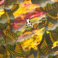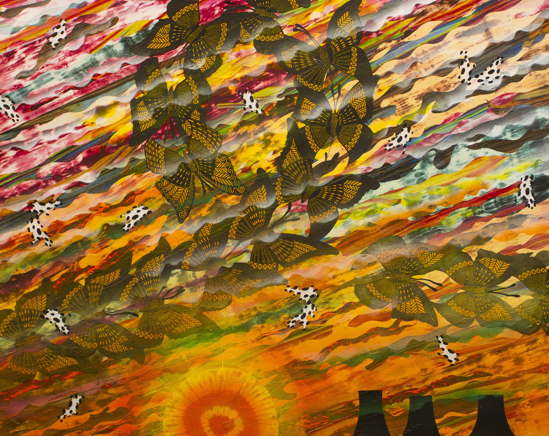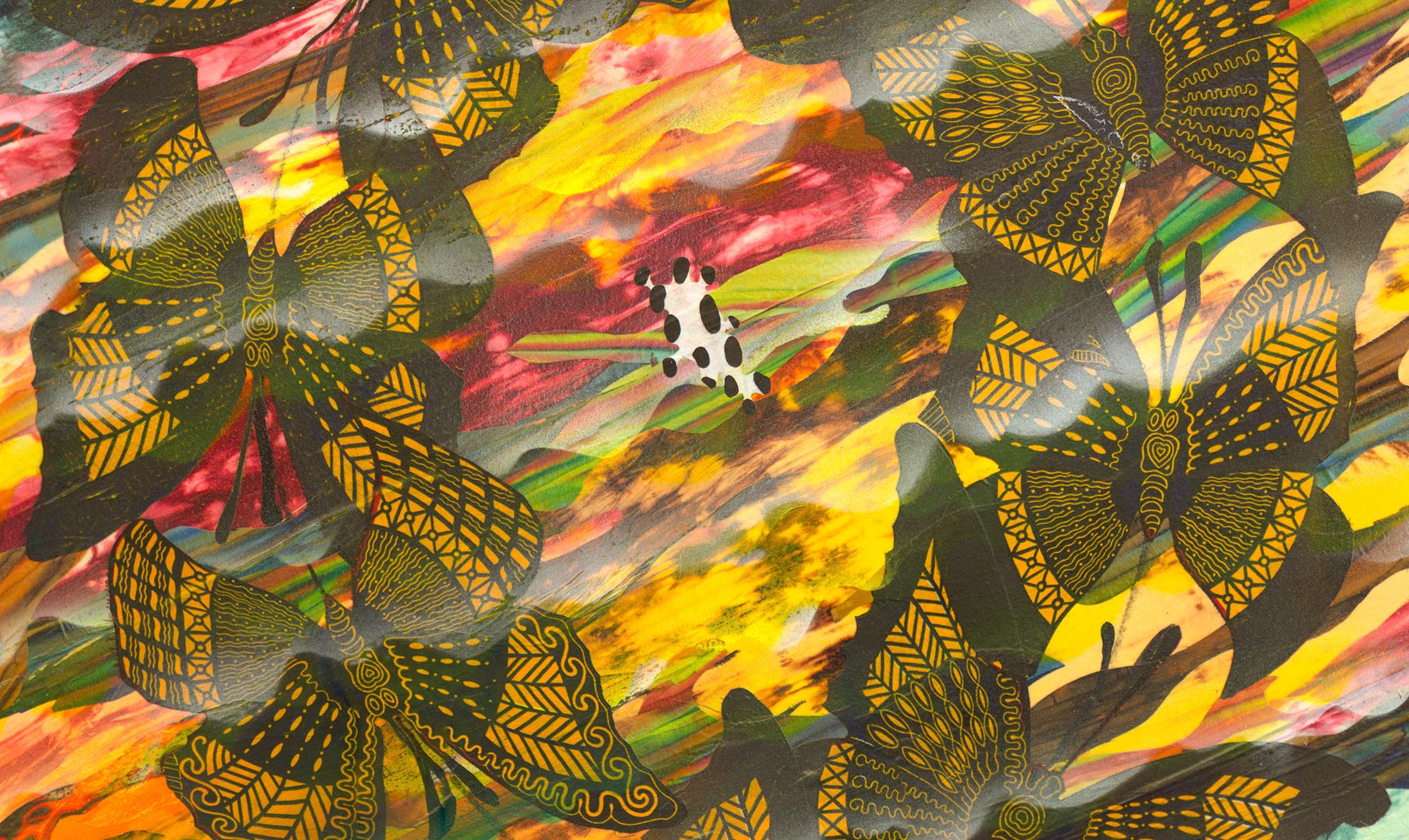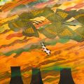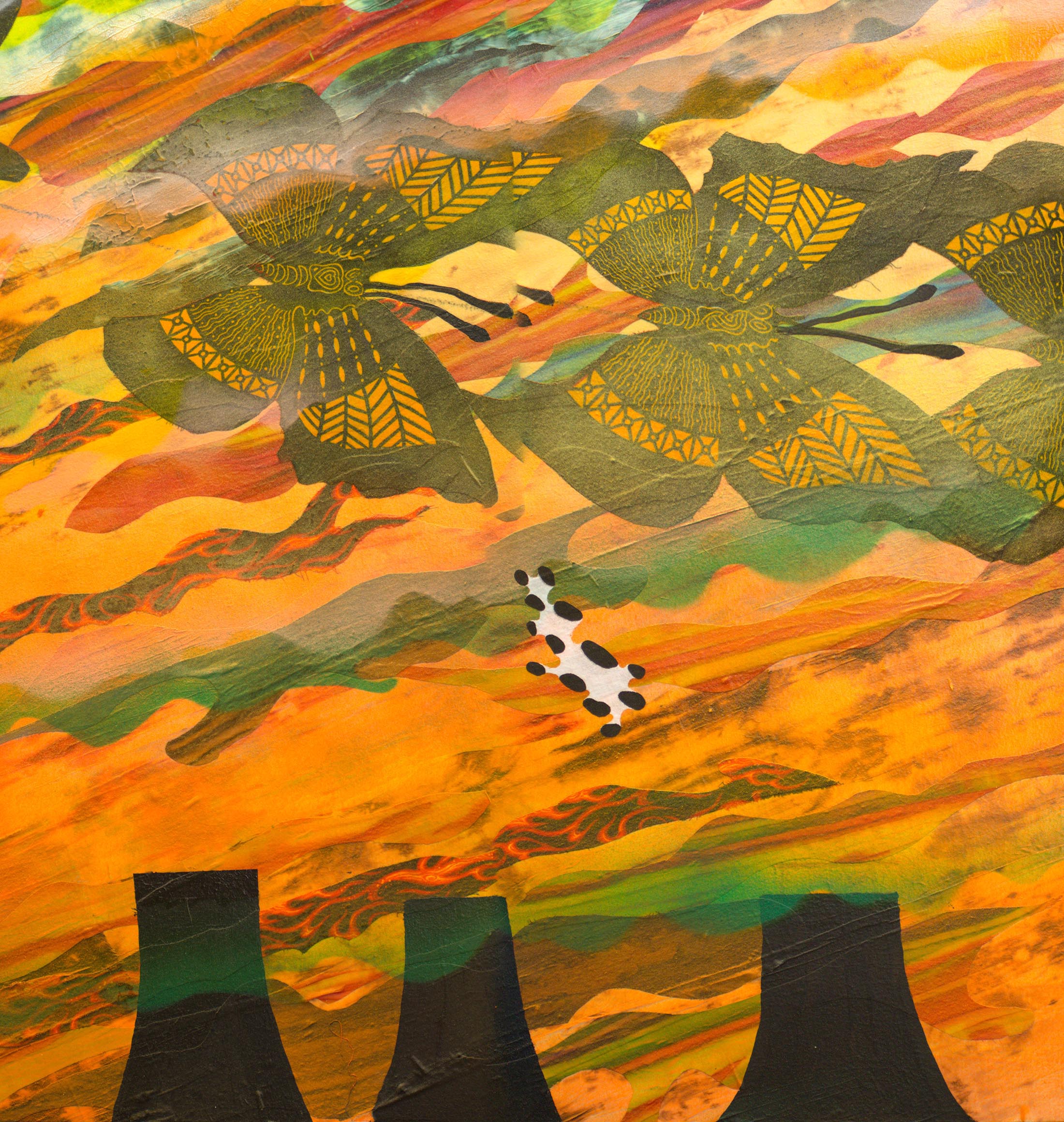 My work is known for its use of varied depictions of natural “scenes”, whether stereotypical landscape views or underwater scenes. The beauty and fragility of life and the tragedy of man’s intervention is my subject. There are few paradises left. As of 2014, I still am using found fabrics from Africa and elsewhere, coupled with mixed paint applications and photo transfers. My use of African prints has added to my vocabulary of forms and patterns. Often their prints use symbolic depictions of natural forms and were recognized by me as similar to my own abstracted natural forms and backgrounds. The manufactured prints add an exotic and surprising aspect to the work. This allows for greater variety and originality in the paintings and an added layer of content that is more specific and somewhat representational. I like the feeling of “craft” that results. The content and meaning of my work has become clearer to the viewer. I am interested in the wildly varied combination of found imagery and depictions of subject that this method has afforded me. From the inspiration of ancient Asian prints, to the contemporary printed motifs inspired by African fabrics, is quite a journey. Ironically, the hand painting has mostly disappeared. Collaged materials and photo imagery has opened a whole new world for me.