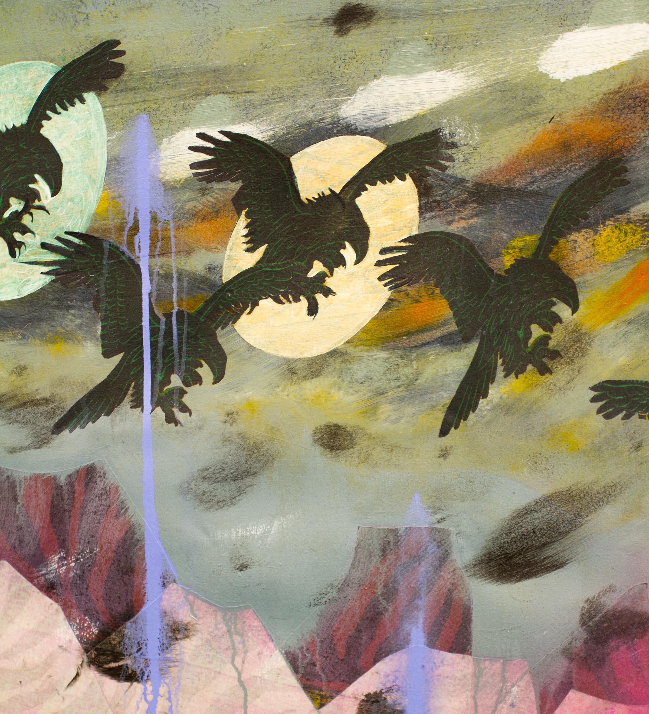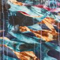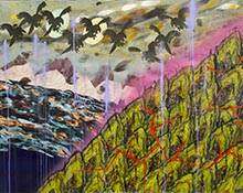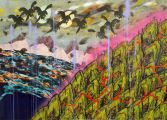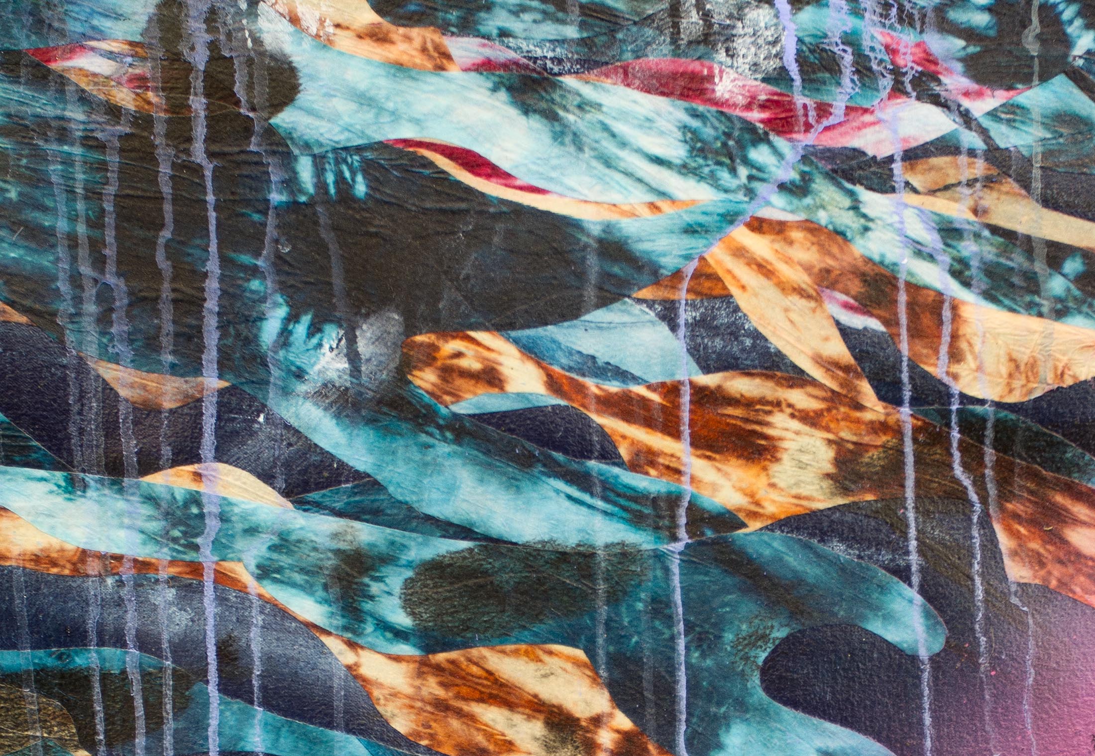 My work is known for its use of varied depictions of natural “scenes”, whether stereotypical landscape views or underwater scenes. The beauty and fragility of life and the tragedy of man’s intervention is my subject. There are few paradises left. As of 2014, I still am using found fabrics from Africa and elsewhere, coupled with mixed paint applications and photo transfers. My use of African prints has added to my vocabulary of forms and patterns. Often their prints use symbolic depictions of natural forms and were recognized by me as similar to my own abstracted natural forms and backgrounds. The manufactured prints add an exotic and surprising aspect to the work. This allows for greater variety and originality in the paintings and an added layer of content that is more specific and somewhat representational. I like the feeling of “craft” that results. The content and meaning of my work has become clearer to the viewer. I am interested in the wildly varied combination of found imagery and depictions of subject that this method has afforded me. From the inspiration of ancient Asian prints, to the contemporary printed motifs inspired by African fabrics, is quite a journey. Ironically, the hand painting has mostly disappeared. Collaged materials and photo imagery has opened a whole new world for me.