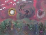 My work is known for its use of varied depictions of natural “scenes”, whether stereotypical landscape views or underwater scenes. The beauty and fragility of life and the tragedy of man’s intervention is my subject. There are few paradises left. As of 2014, I still am using found fabrics from Africa and elsewhere, coupled with mixed paint applications and photo transfers. My use of African prints has added to my vocabulary of forms and patterns. Often their prints use symbolic depictions of natural forms and were recognized by me as similar to my own abstracted natural forms and backgrounds. The manufactured prints add an exotic and surprising aspect to the work. This allows for greater variety and originality in the paintings and an added layer of content that is more specific and somewhat representational. I like the feeling of “craft” that results. The content and meaning of my work has become clearer to the viewer. I am interested in the wildly varied combination of found imagery and depictions of subject that this method has afforded me. From the inspiration of ancient Asian prints, to the contemporary printed motifs inspired by African fabrics, is quite a journey. Ironically, the hand painting has mostly disappeared. Collaged materials and photo imagery has opened a whole new world for me.