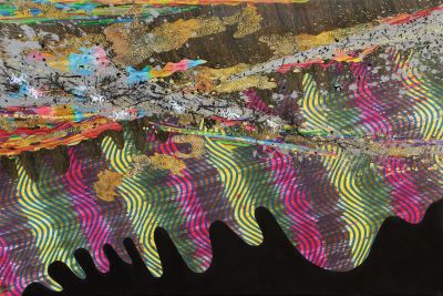 My work is known for its use of varied depictions of natural “scenes”, whether stereotypical landscape views or underwater scenes. The beauty and fragility of life and the tragedy of man’s intervention is my subject. There are few paradises left. As of 2014, I still am using found fabrics from Africa and elsewhere, coupled with mixed paint applications and photo transfers. My use of African prints has added to my vocabulary of forms and patterns. Often their prints use symbolic depictions of natural forms and were recognized by me as similar to my own abstracted natural forms and backgrounds. The manufactured prints add an exotic and surprising aspect to the work. This allows for greater variety and originality in the paintings and an added layer of content that is more specific and somewhat representational. I like the feeling of “craft” that results. The content and meaning of my work has become clearer to the viewer. I am interested in the wildly varied combination of found imagery and depictions of subject that this method has afforded me. From the inspiration of ancient Asian prints, to the contemporary printed motifs inspired by African fabrics, is quite a journey. Ironically, the hand painting has mostly disappeared. Collaged materials and photo imagery has opened a whole new world for me.
