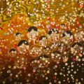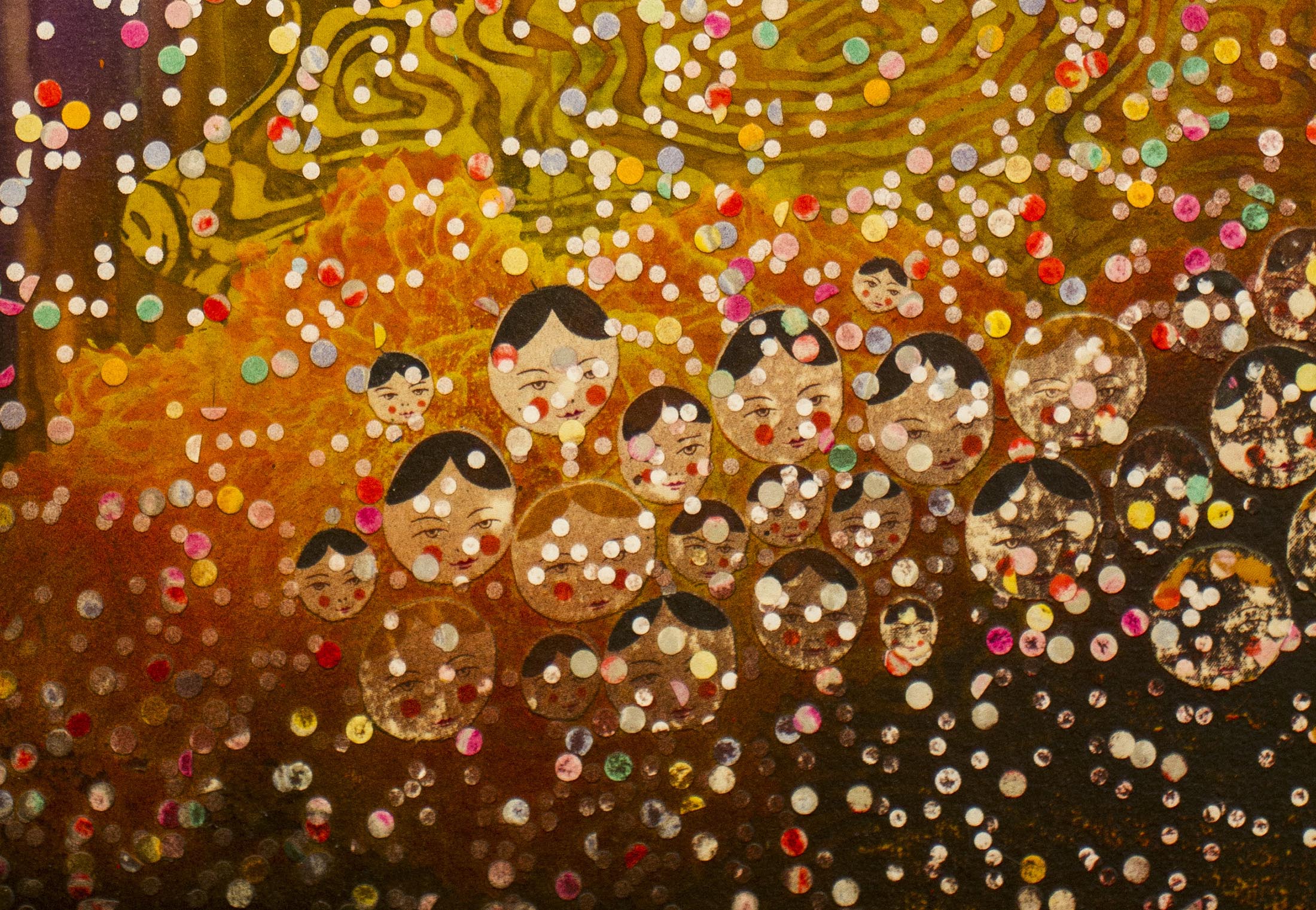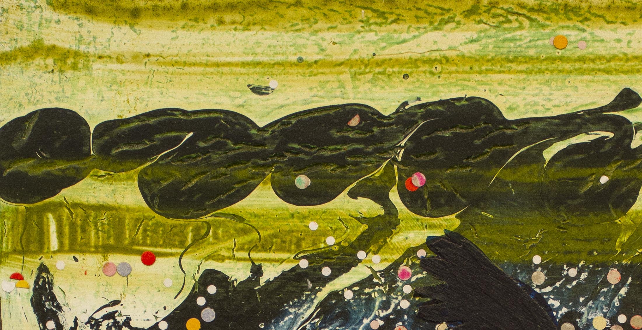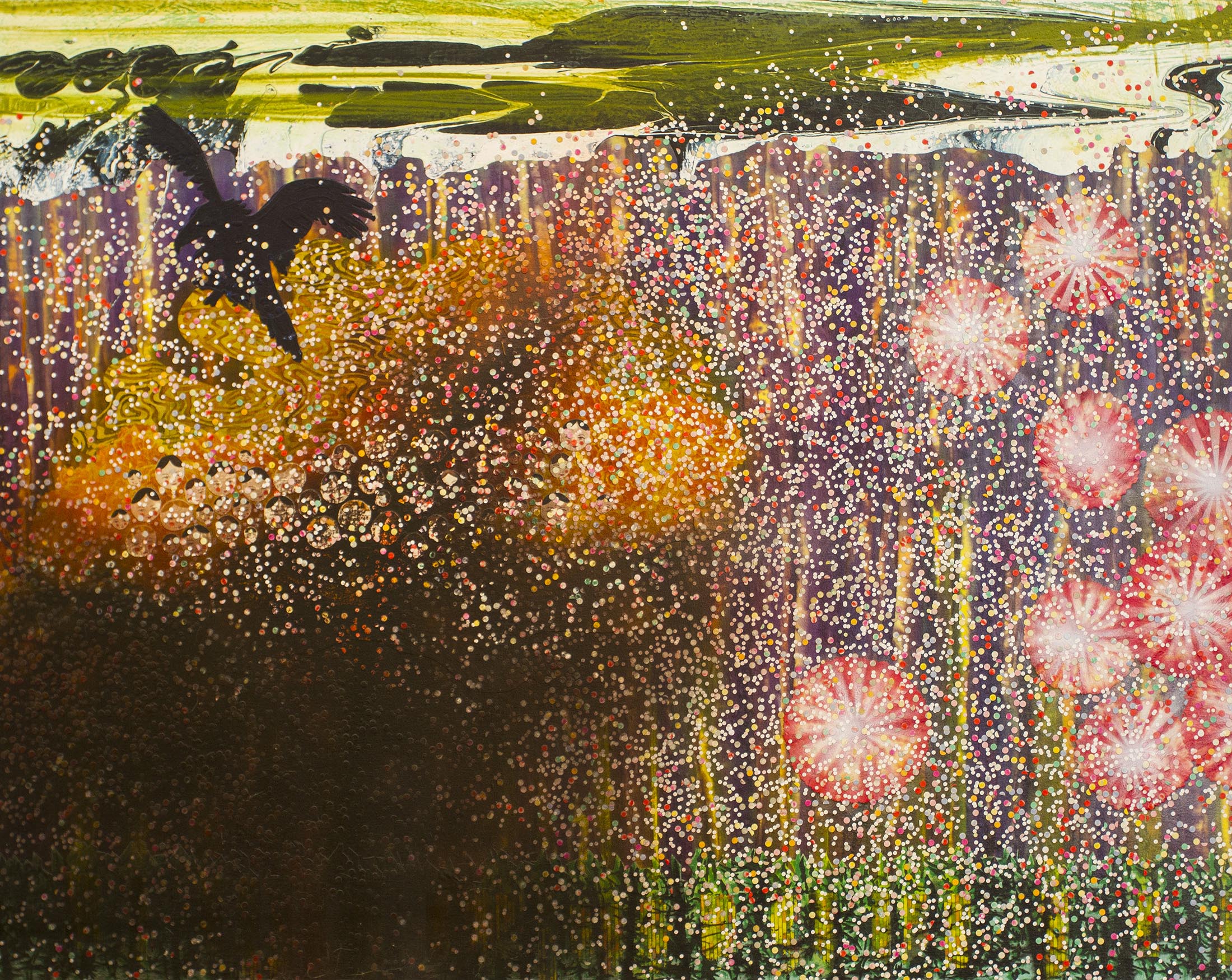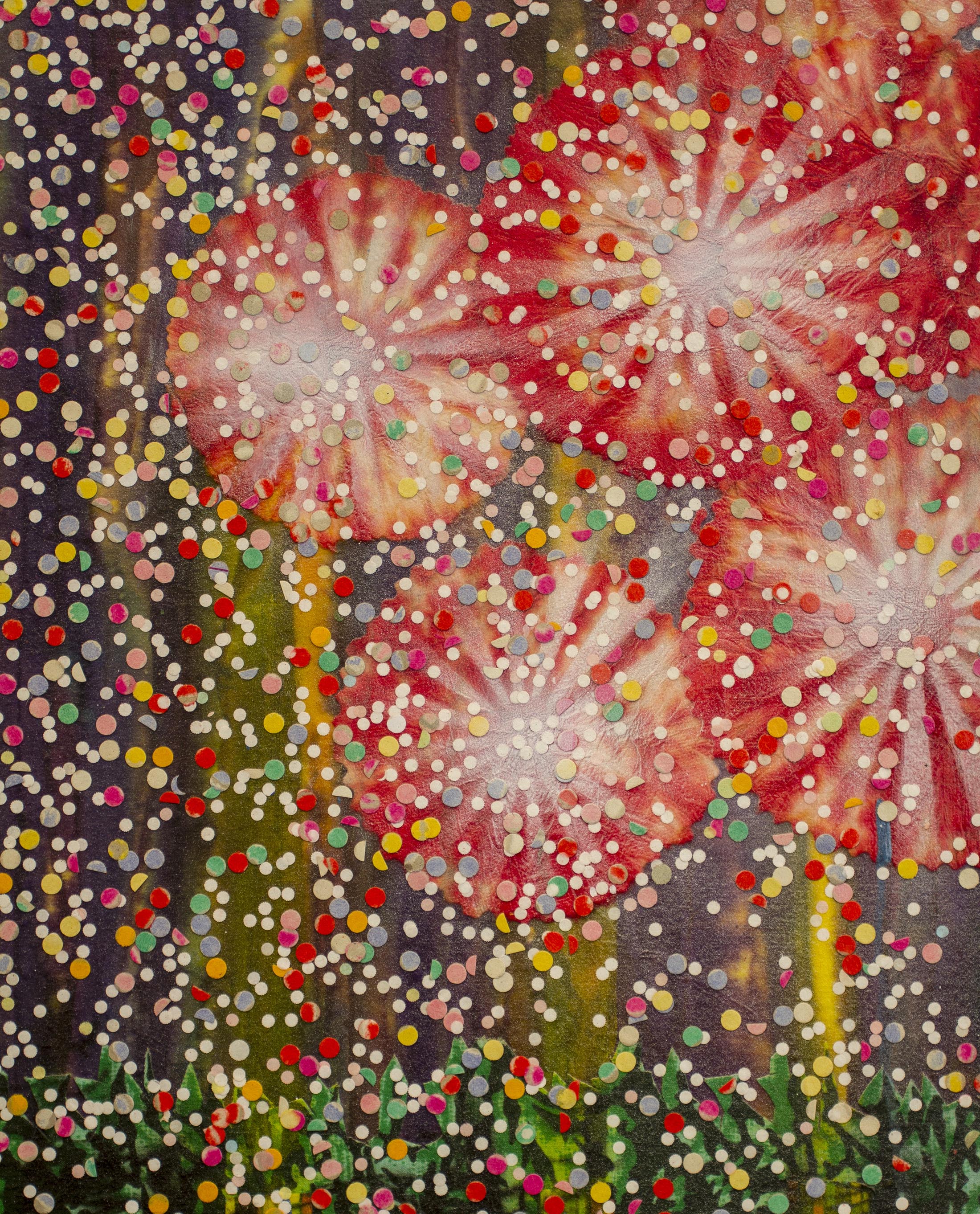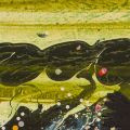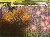 My work is known for its use of varied depictions of natural “scenes”, whether stereotypical landscape views or underwater scenes. The beauty and fragility of life and the tragedy of man’s intervention is my subject. There are few paradises left. As of 2014, I still am using found fabrics from Africa and elsewhere, coupled with mixed paint applications and photo transfers. My use of African prints has added to my vocabulary of forms and patterns. Often their prints use symbolic depictions of natural forms and were recognized by me as similar to my own abstracted natural forms and backgrounds. The manufactured prints add an exotic and surprising aspect to the work. This allows for greater variety and originality in the paintings and an added layer of content that is more specific and somewhat representational. I like the feeling of “craft” that results. The content and meaning of my work has become clearer to the viewer. I am interested in the wildly varied combination of found imagery and depictions of subject that this method has afforded me. From the inspiration of ancient Asian prints, to the contemporary printed motifs inspired by African fabrics, is quite a journey. Ironically, the hand painting has mostly disappeared. Collaged materials and photo imagery has opened a whole new world for me.