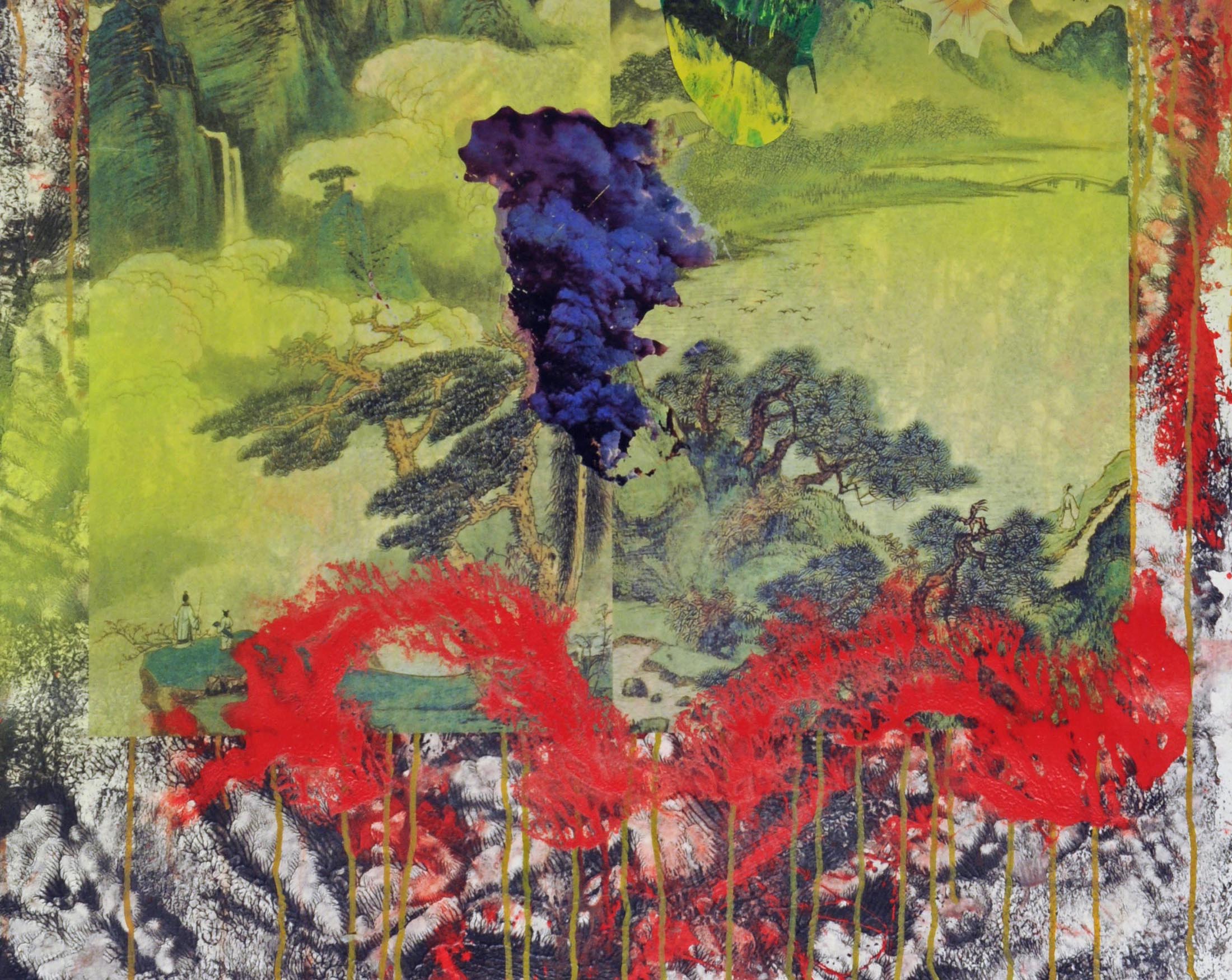 My work is known for its use of varied depictions of natural “scenes”, whether stereotypical landscape views or underwater scenes. The beauty and fragility of life and the tragedy of man’s intervention is my subject. There are few paradises left. As of 2014, I still am using found fabrics from Africa and elsewhere, coupled with mixed paint applications and photo transfers. My use of African prints has added to my vocabulary of forms and patterns. Often their prints use symbolic depictions of natural forms and were recognized by me as similar to my own abstracted natural forms and backgrounds. The manufactured prints add an exotic and surprising aspect to the work. This allows for greater variety and originality in the paintings and an added layer of content that is more specific and somewhat representational. I like the feeling of “craft” that results. The content and meaning of my work has become clearer to the viewer. I am interested in the wildly varied combination of found imagery and depictions of subject that this method has afforded me. From the inspiration of ancient Asian prints, to the contemporary printed motifs inspired by African fabrics, is quite a journey. Ironically, the hand painting has mostly disappeared. Collaged materials and photo imagery has opened a whole new world for me.