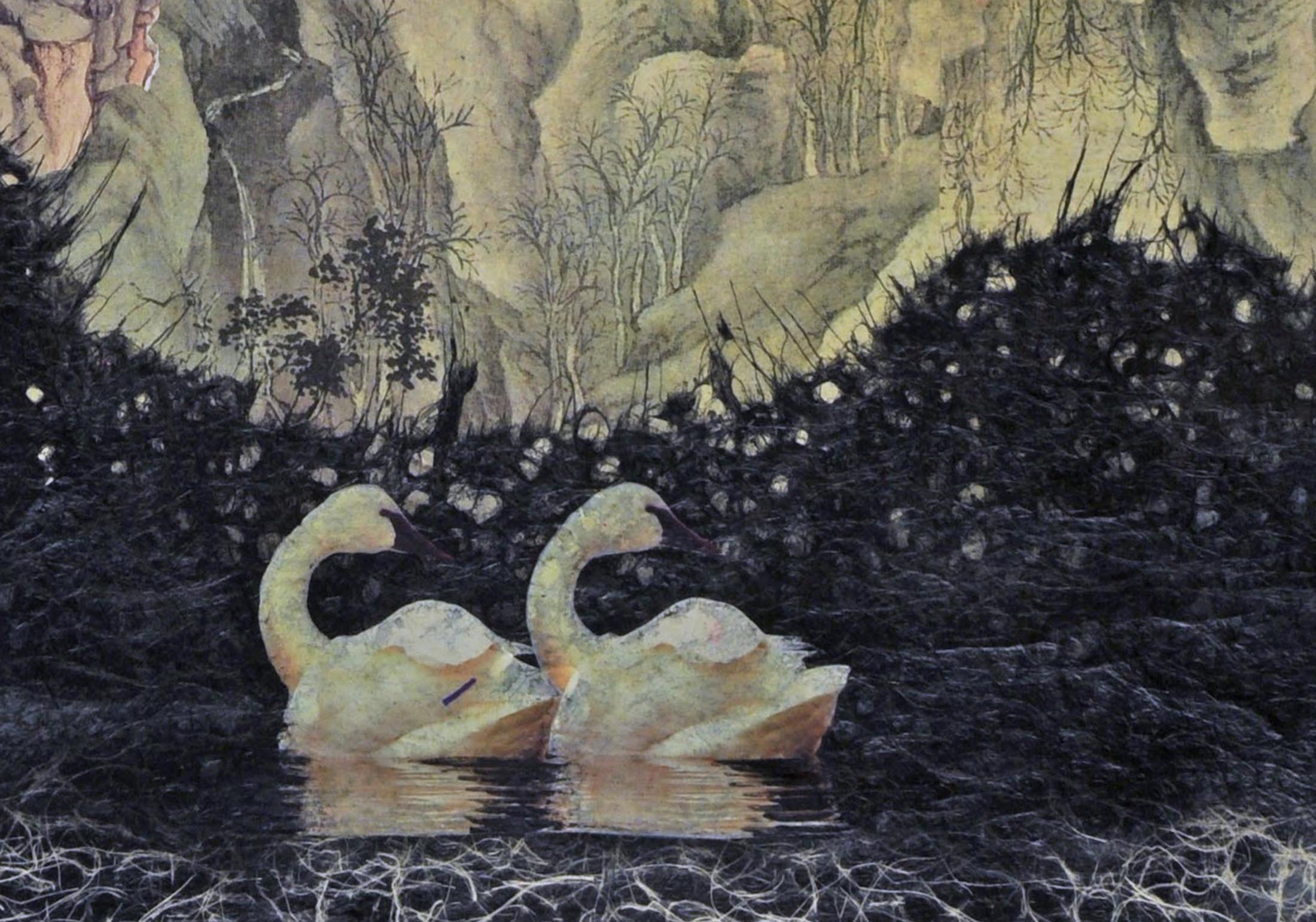 Paper collage, acrylic, lace, photo downloads on Arches paper.
