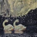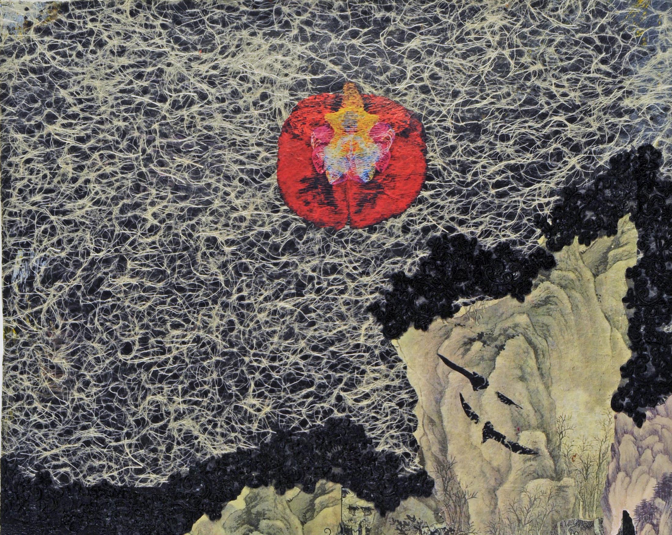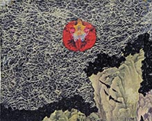 My work is known for its use of varied depictions of natural “scenes”, whether stereotypical landscape views or underwater scenes. The beauty and fragility of life and the tragedy of man’s intervention is my subject. There are few paradises left. As of 2014, I still am using found fabrics from Africa and elsewhere, coupled with mixed paint applications and photo transfers. My use of African prints has added to my vocabulary of forms and patterns. Often their prints use symbolic depictions of natural forms and were recognized by me as similar to my own abstracted natural forms and backgrounds. The manufactured prints add an exotic and surprising aspect to the work. This allows for greater variety and originality in the paintings and an added layer of content that is more specific and somewhat representational. I like the feeling of “craft” that results. The content and meaning of my work has become clearer to the viewer. I am interested in the wildly varied combination of found imagery and depictions of subject that this method has afforded me. From the inspiration of ancient Asian prints, to the contemporary printed motifs inspired by African fabrics, is quite a journey. Ironically, the hand painting has mostly disappeared. Collaged materials and photo imagery has opened a whole new world for me.