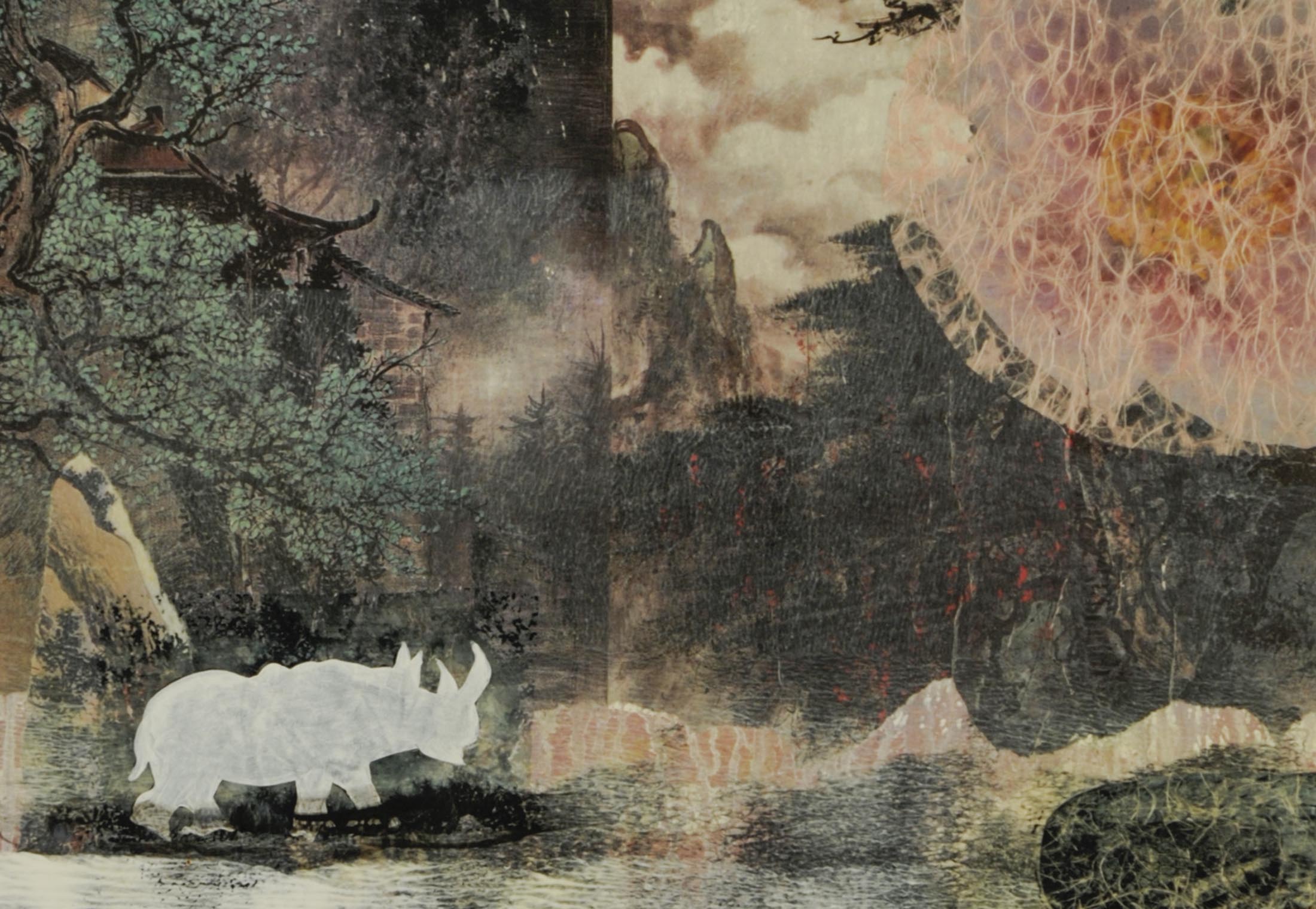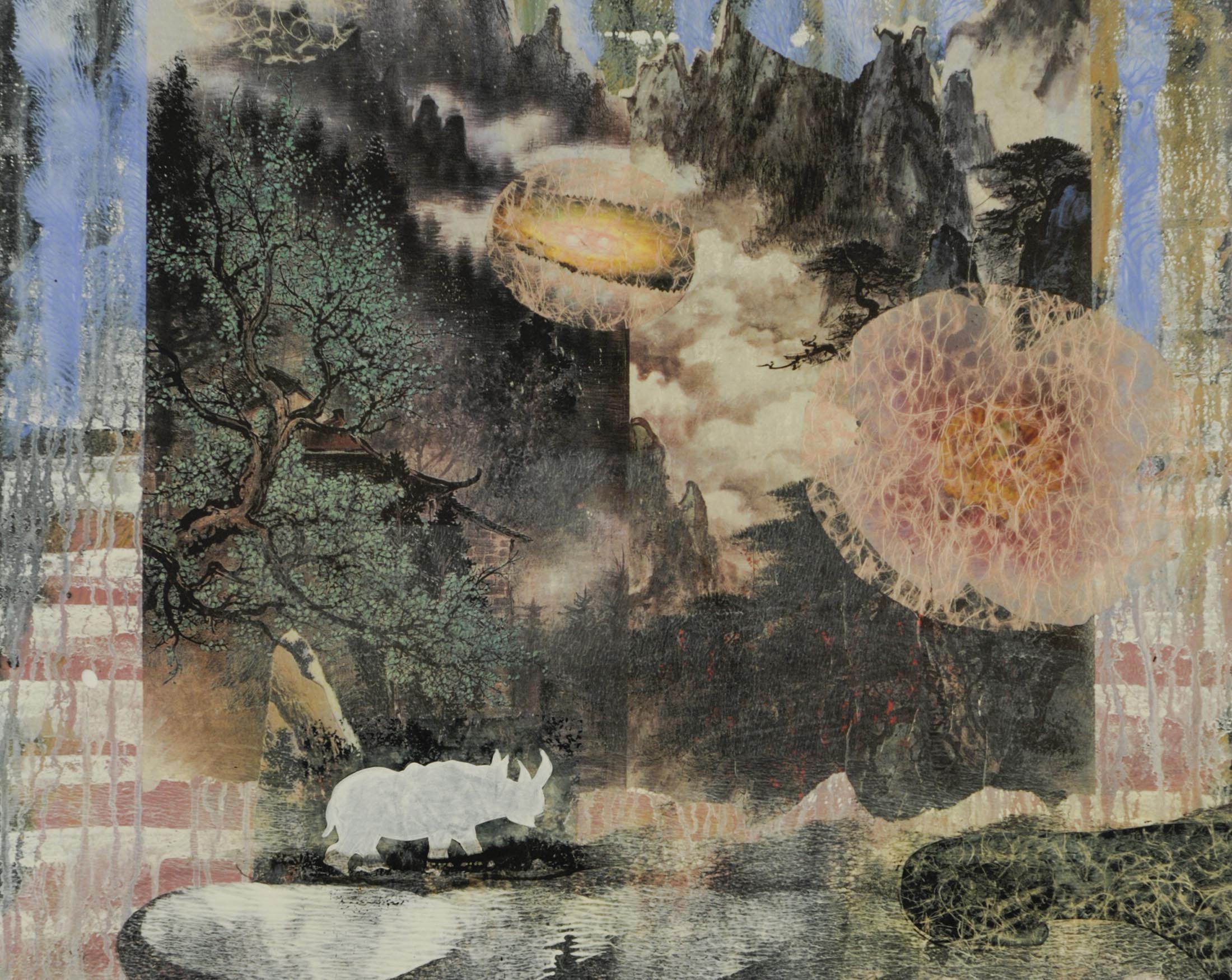 My work is known for its use of varied depictions of natural “scenes”, whether stereotypical landscape views or underwater scenes. The beauty and fragility of life and the tragedy of man’s intervention is my subject. There are few paradises left. As of 2014, I still am using found fabrics from Africa and elsewhere, coupled with mixed paint applications and photo transfers. My use of African prints has added to my vocabulary of forms and patterns. Often their prints use symbolic depictions of natural forms and were recognized by me as similar to my own abstracted natural forms and backgrounds. The manufactured prints add an exotic and surprising aspect to the work. This allows for greater variety and originality in the paintings and an added layer of content that is more specific and somewhat representational. I like the feeling of “craft” that results. The content and meaning of my work has become clearer to the viewer. I am interested in the wildly varied combination of found imagery and depictions of subject that this method has afforded me. From the inspiration of ancient Asian prints, to the contemporary printed motifs inspired by African fabrics, is quite a journey. Ironically, the hand painting has mostly disappeared. Collaged materials and photo imagery has opened a whole new world for me.