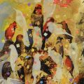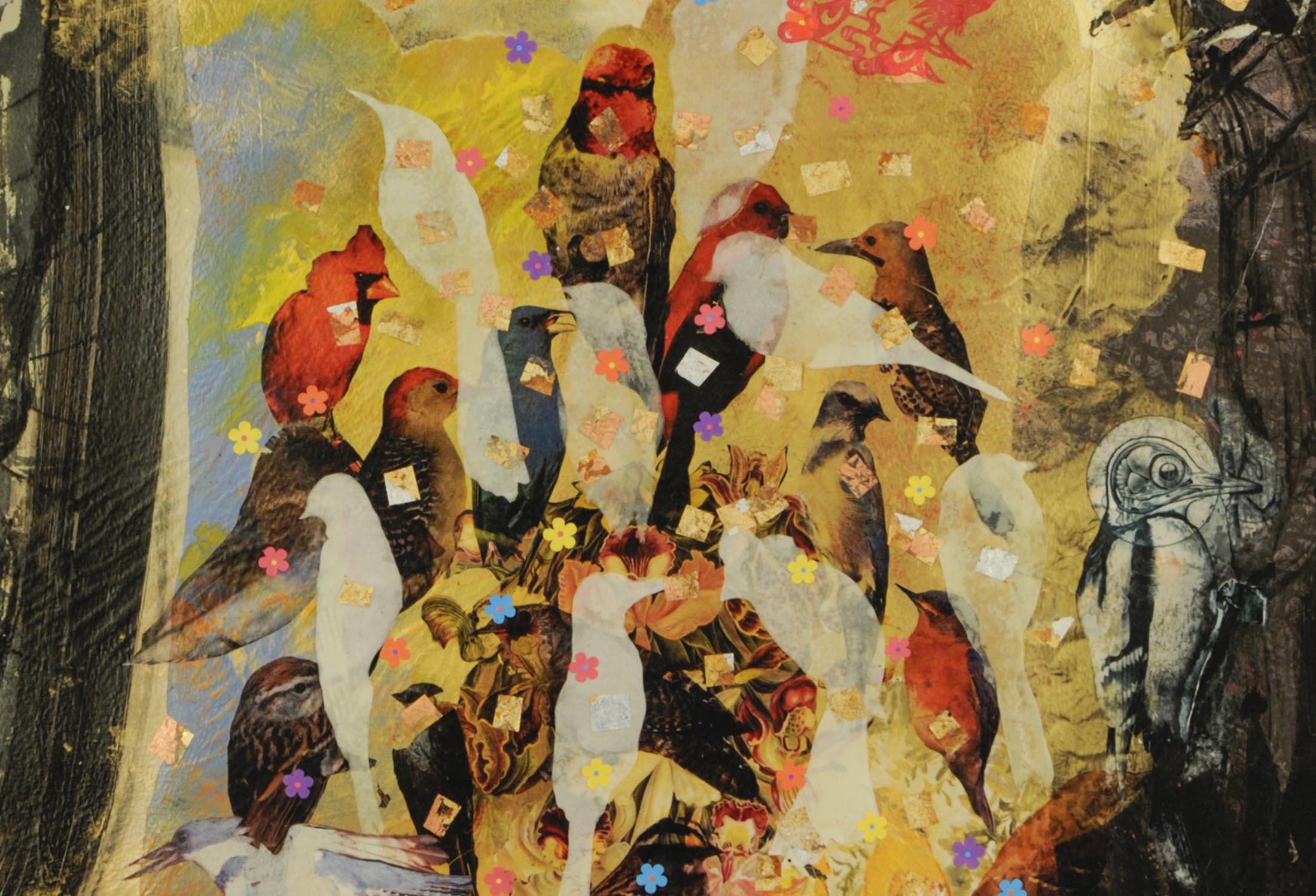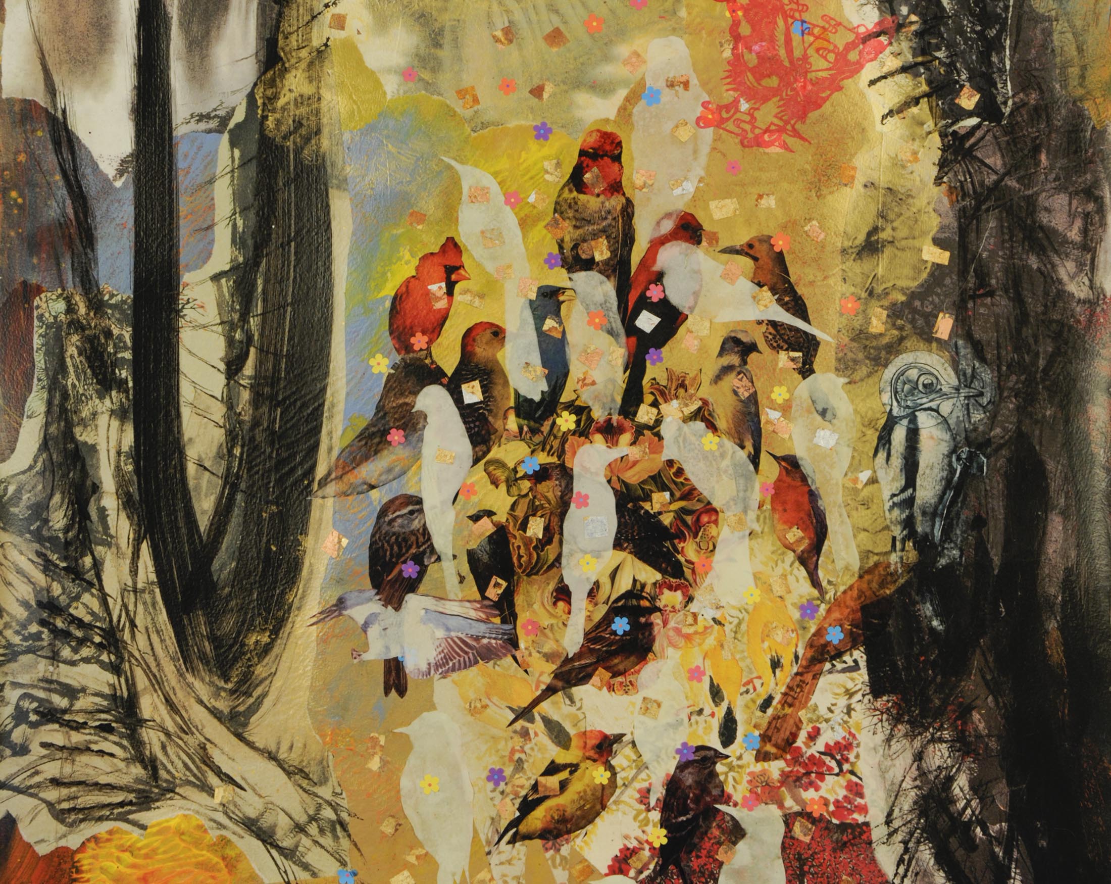 My work is known for its use of varied depictions of natural “scenes”, whether stereotypical landscape views or underwater scenes. The beauty and fragility of life and the tragedy of man’s intervention is my subject. There are few paradises left. As of 2014, I still am using found fabrics from Africa and elsewhere, coupled with mixed paint applications and photo transfers. My use of African prints has added to my vocabulary of forms and patterns. Often their prints use symbolic depictions of natural forms and were recognized by me as similar to my own abstracted natural forms and backgrounds. The manufactured prints add an exotic and surprising aspect to the work. This allows for greater variety and originality in the paintings and an added layer of content that is more specific and somewhat representational. I like the feeling of “craft” that results. The content and meaning of my work has become clearer to the viewer. I am interested in the wildly varied combination of found imagery and depictions of subject that this method has afforded me. From the inspiration of ancient Asian prints, to the contemporary printed motifs inspired by African fabrics, is quite a journey. Ironically, the hand painting has mostly disappeared. Collaged materials and photo imagery has opened a whole new world for me.