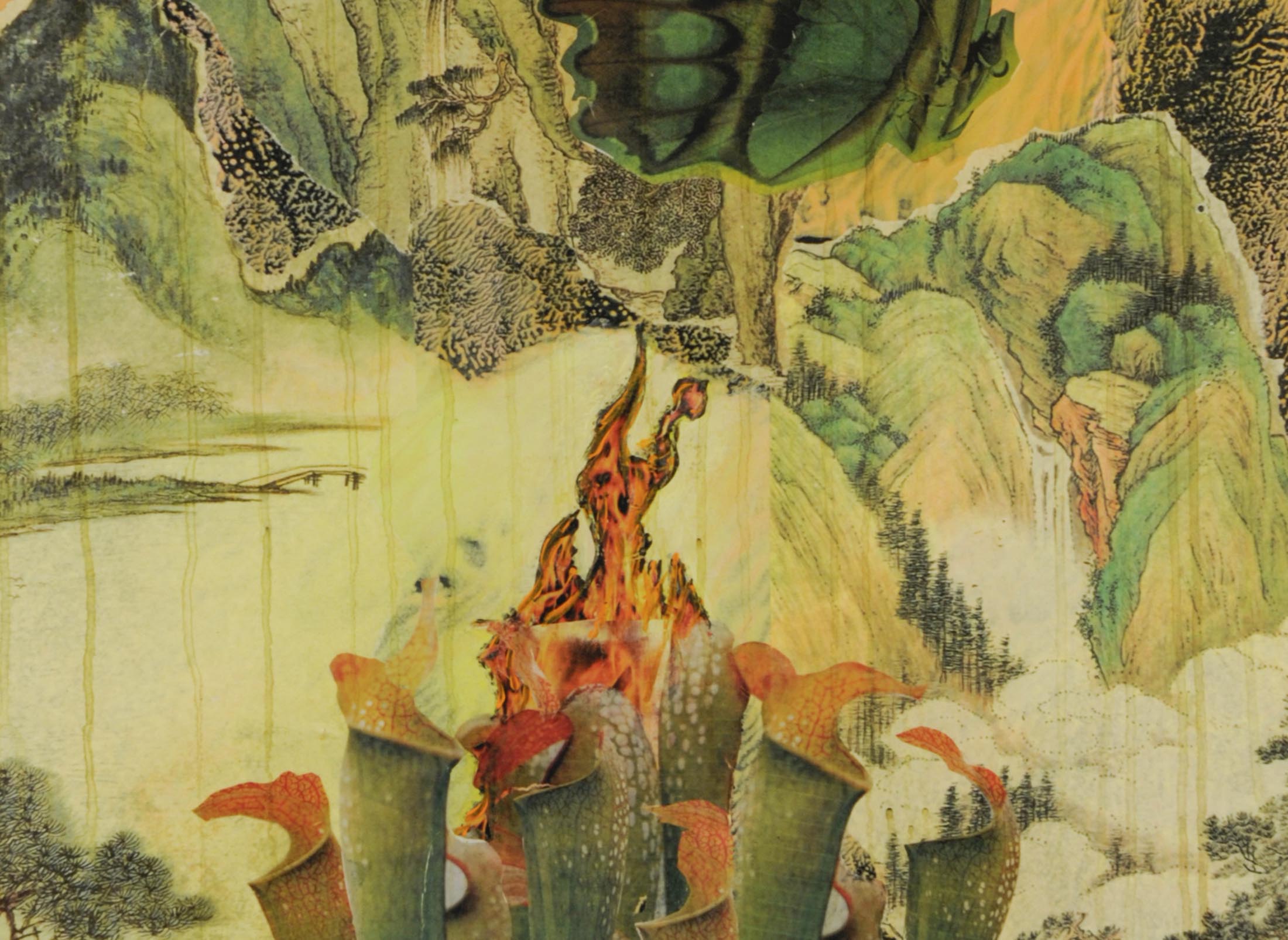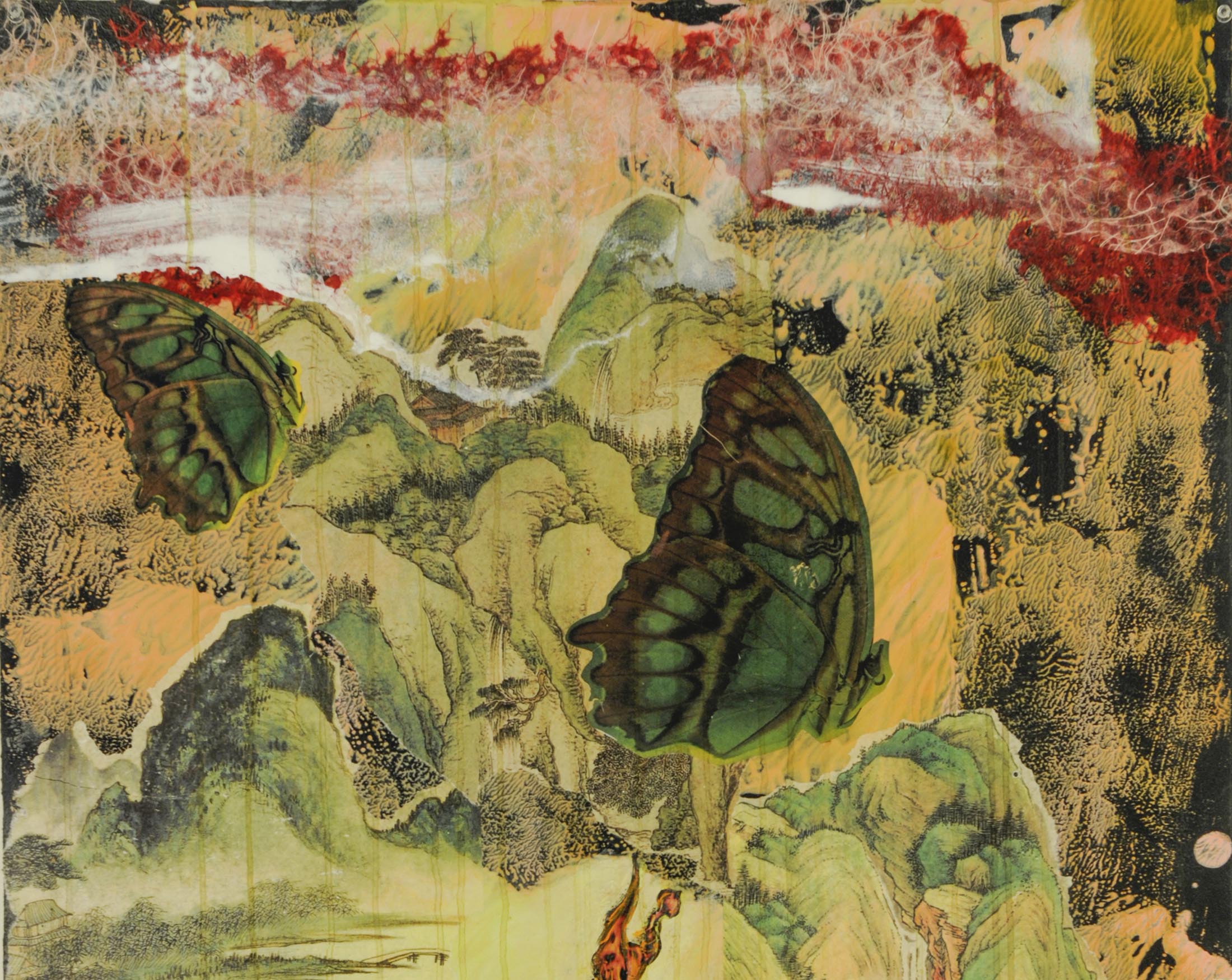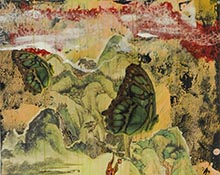 My work is known for its use of varied depictions of natural “scenes”, whether stereotypical landscape views or underwater scenes. The beauty and fragility of life and the tragedy of man’s intervention is my subject. There are few paradises left. As of 2014, I still am using found fabrics from Africa and elsewhere, coupled with mixed paint applications and photo transfers. My use of African prints has added to my vocabulary of forms and patterns. Often their prints use symbolic depictions of natural forms and were recognized by me as similar to my own abstracted natural forms and backgrounds. The manufactured prints add an exotic and surprising aspect to the work. This allows for greater variety and originality in the paintings and an added layer of content that is more specific and somewhat representational. I like the feeling of “craft” that results. The content and meaning of my work has become clearer to the viewer. I am interested in the wildly varied combination of found imagery and depictions of subject that this method has afforded me. From the inspiration of ancient Asian prints, to the contemporary printed motifs inspired by African fabrics, is quite a journey. Ironically, the hand painting has mostly disappeared. Collaged materials and photo imagery has opened a whole new world for me.